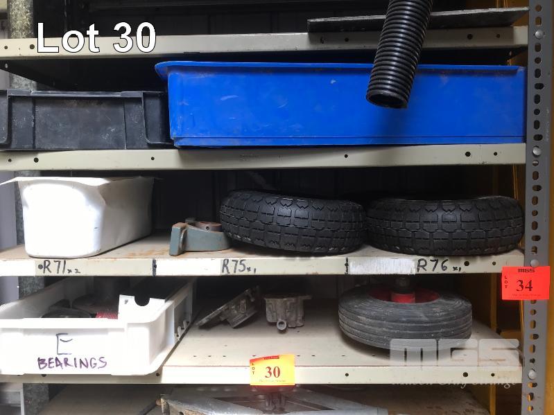 SOLID HAND TROLLEY TYRES, CABINET FEET, EXTRACTION HOSE, BEARINGS, ETC 4 x SHELVES