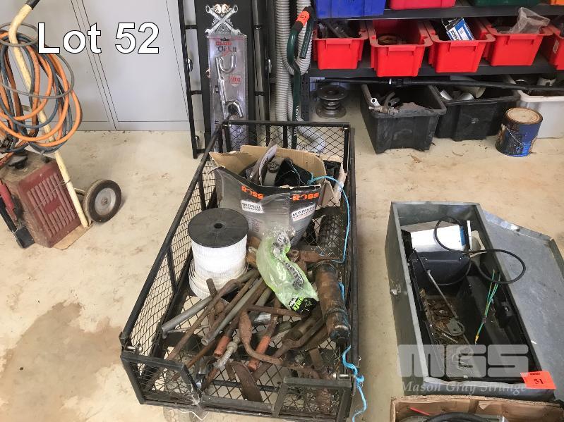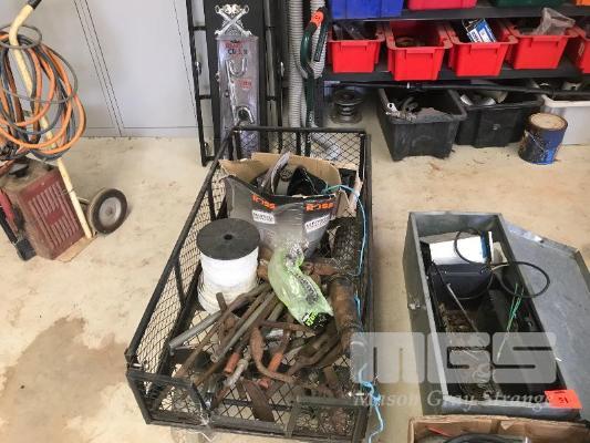 UTILITY/GARDEN CART, STEEL MESH, 4 WHEEL & CONTENTS HAND TOOLS, WELDING MASK, ELECTRIC FENCE HOTWIRE, ETC
