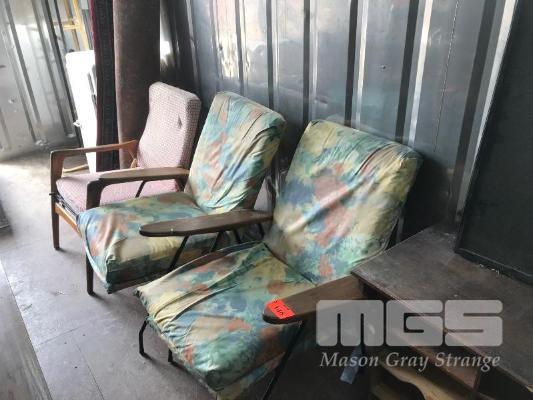 PAIR ARM CHAIRS, WROUGHT IRON FRAME, TEAK FRAMED ARM CHAIR & FLOOR RUG