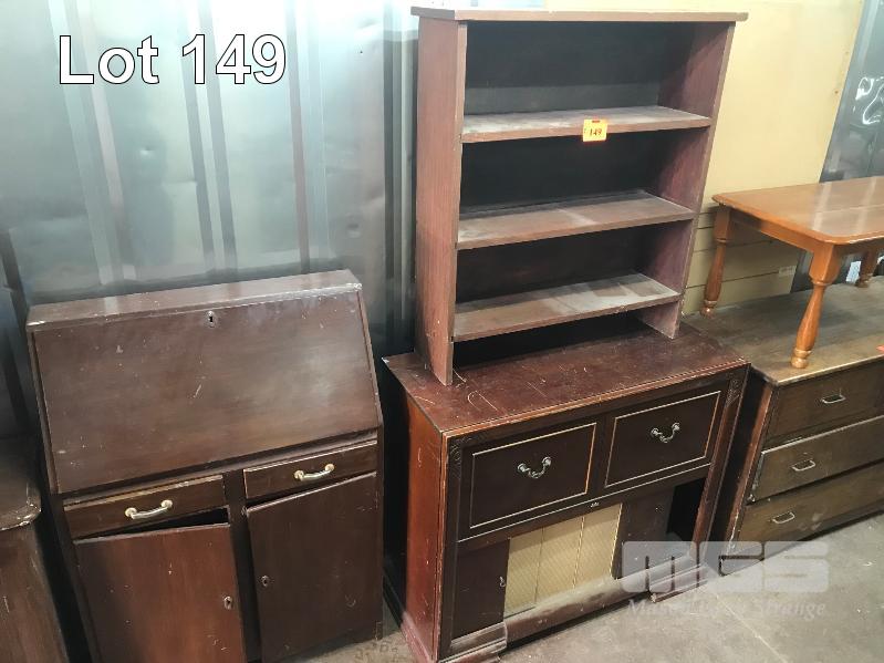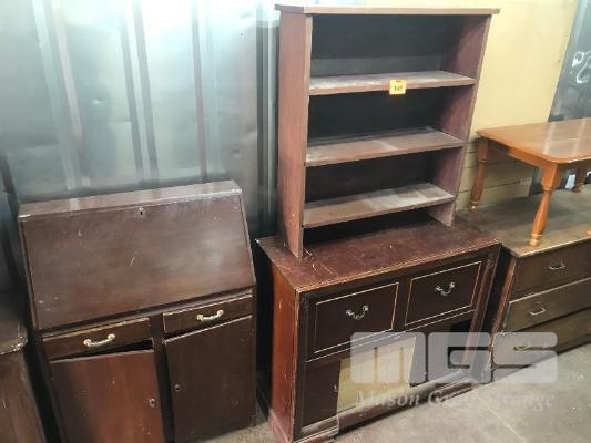FALL FRONT WRITING DESK, HALF HEIGHT SHELF UNIT & STEREOGRAM WITH BUILT IN TURNTABLE & RADIO TUNER