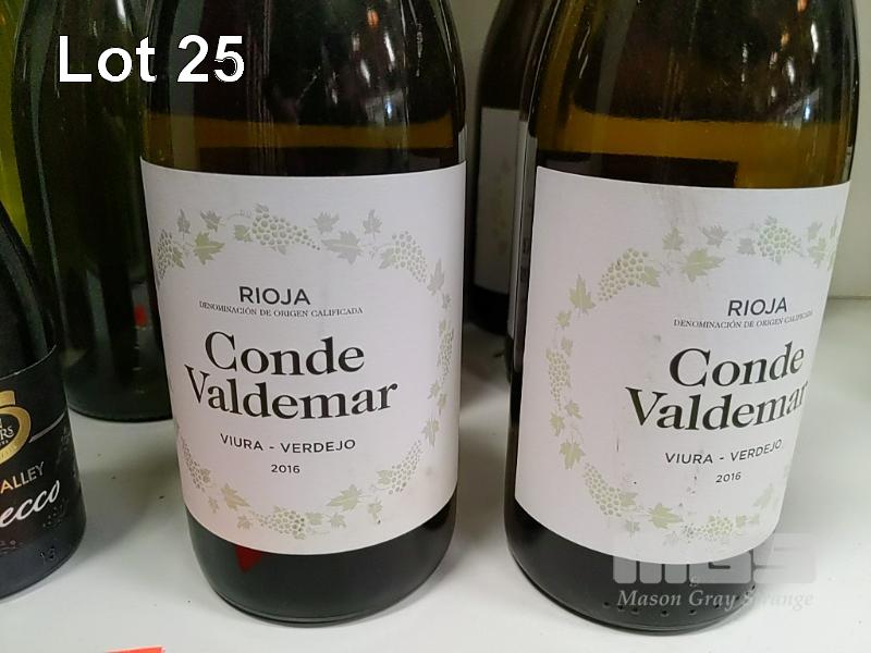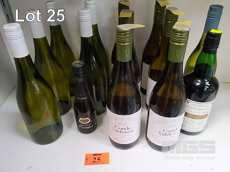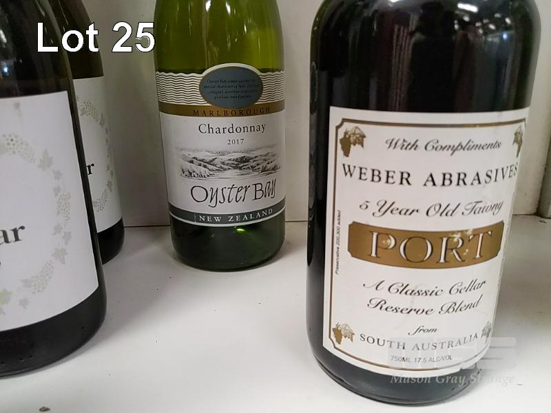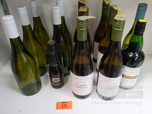 6 X BOTTLES OF 2016, CONDE VALDEMAR, 5 X BOTTLES OF WHITE WINE CLEANSKINS, 1 X BOTTLE OF 2017, OYSTER BAY, CHARDONNAY, NEW ZEALAND, 1 X BOTTLE OF WEBER ABRASIVES, OLD TAWNY PORT, 1 X SMALL BOTTLE OF BROWN BROS, PROSECCO