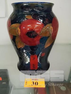 MOORCROFT VASE, BLUE GLAZED WITH EMBOSSED FRUIT, HEIGHT 21cm