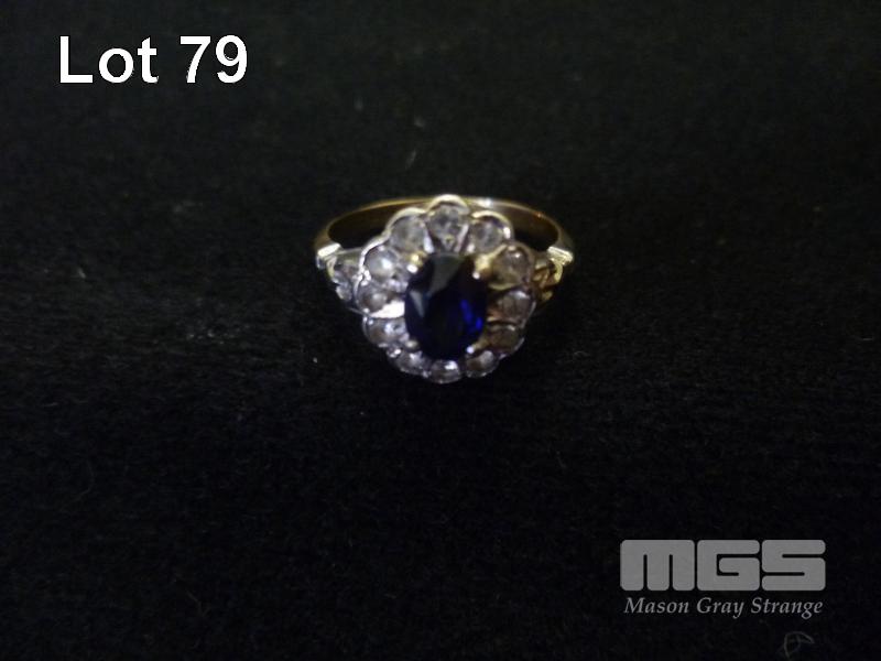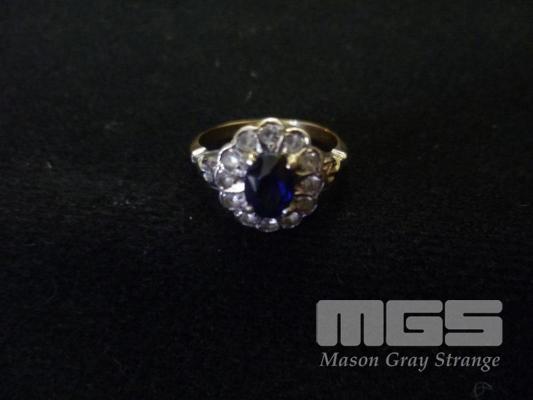GOLD RING, SET WITH LARGE SAPPHIRE & SMALL CLEAR STONES, MARKED 9ct, 3.5g