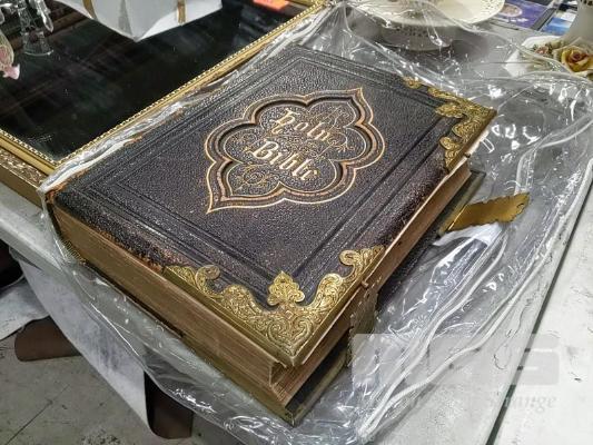 ANTIQUE LEATHER AND BRASS BOUND JOHN EADIE BIBLE