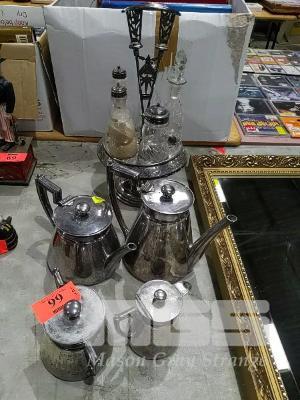 ASSORTED EPNS INCLUDING 6-BOTTLE CRUET STAND, TEA POTS, MILK JUG AND SUGAR POT