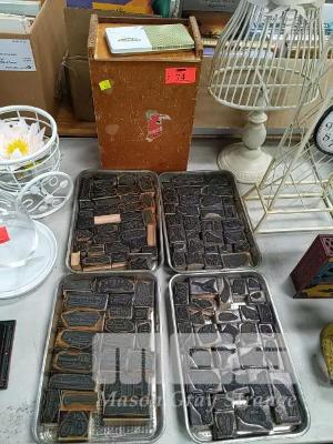 VINTAGE CLASSROOM RUBBER STAMPS, 3 x TRAYS WITH STORAGE BOX AND INKPAD.