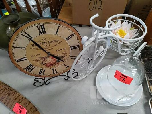 3 x MANTELPIECE ORNAMENTS: CLOCK, TRICYCLE AND GLASS DOME WITH TRAY
