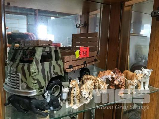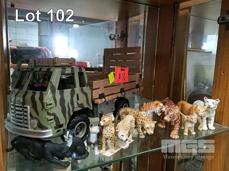 SCHLEICH SAFARI TRUCK AND COLLECTION OF SCHLEICH BIG CAT FIGURINES (1 x SHELF)