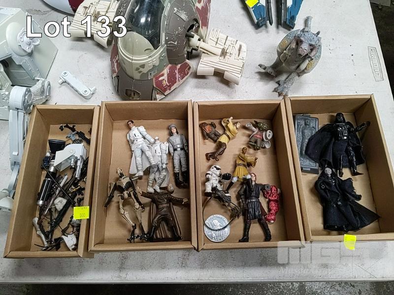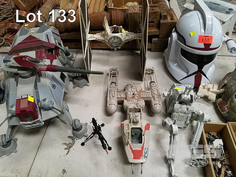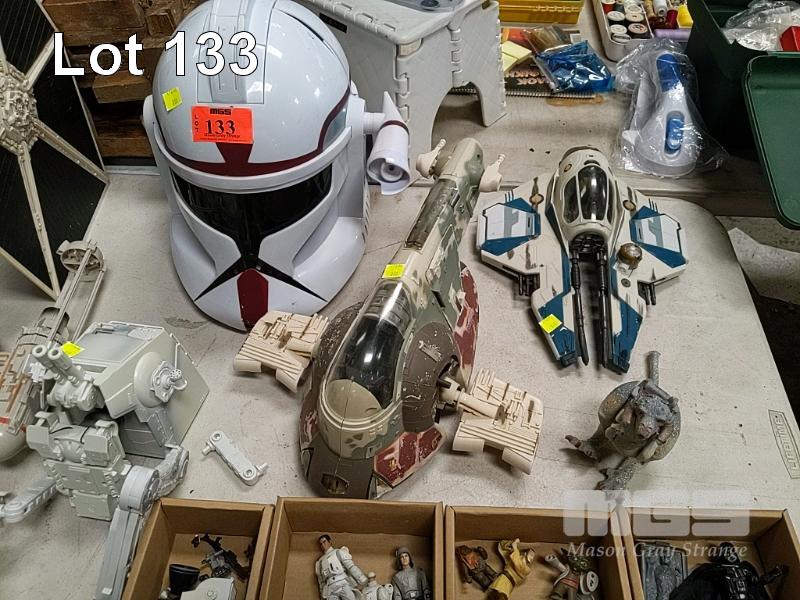 COLLECTION OF STAR WARS TOYS INCLUDING STORMTROOPER TALKING HELMET, BOBA FETT SPACESHIP, OBI WAN KENOBI STARFIGHTER, IMPERIAL TIE FIGHTER, REPUBLIC TANK, Y-WING FIGHTER, FIGURINES, PARTS AND MORE