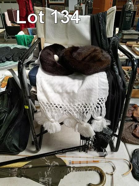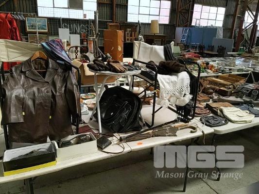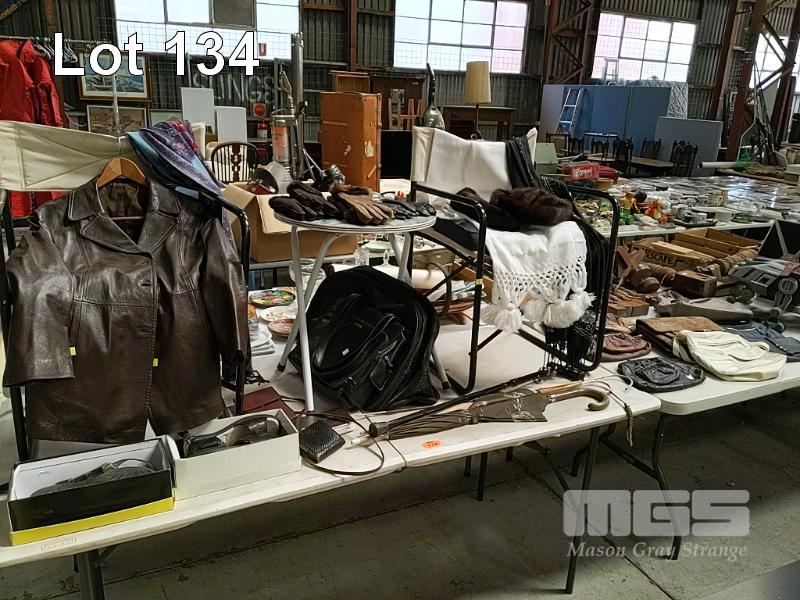 COLLECTION OF LADIES CLOTHING, HANDBAGS, PURSES, SHOES, UMBRELLAS, FOLDING CHAIRS ETC. INCLUDES LEATHER JACKET, GLOVES, FUR HATS AND MORE