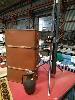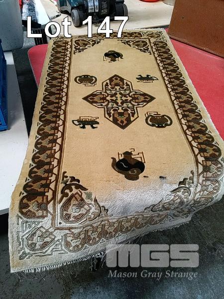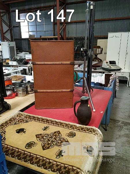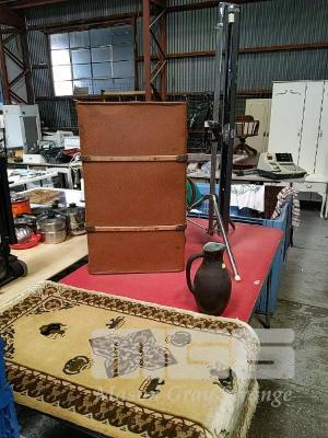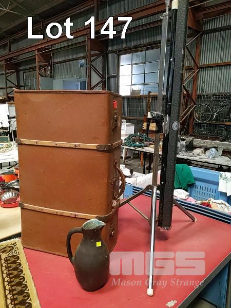 VINTAGE SUITCASE, VINTAGE PROJECTOR SCREEN, FLOOR RUG AND STONEWARE JUG.