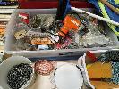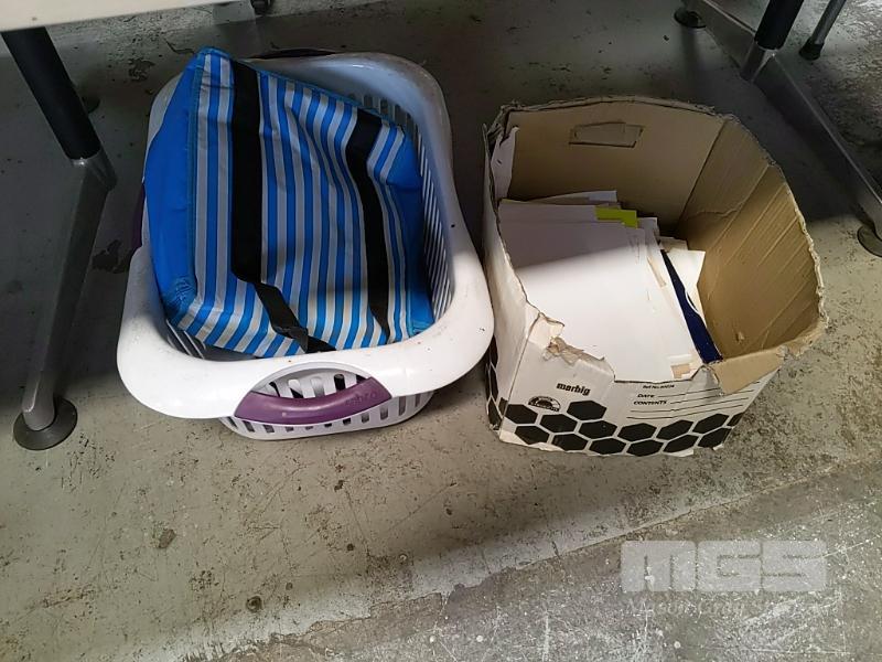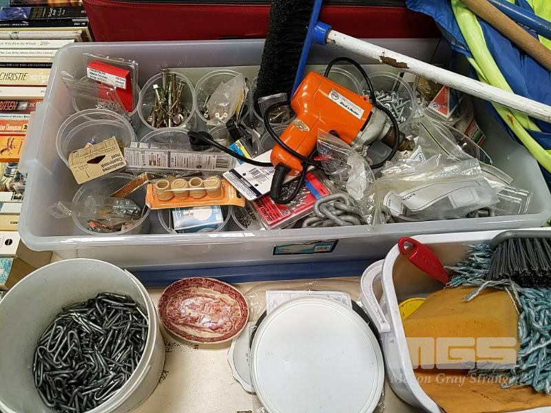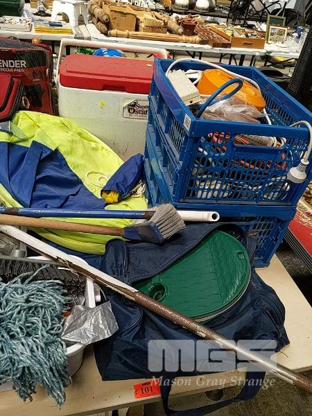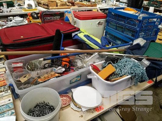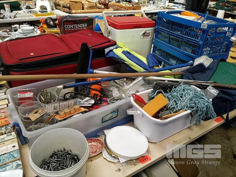 ASSORTED ITEMS INCLUDING SAMSONITE SUITCASE, QUANTITY OF WRAPPING PAPER, COLEMAN ESKY, BEACH SHELTER, INFLATABLE MATTRESS, HOME HARDWARE SUPPLIES, QUANTITY OF EXTENSION CORDS & POWER BOARDS, VINTAGE BLACK AND DECKER POWER DRILL AND MORE (1 x TABLE)