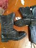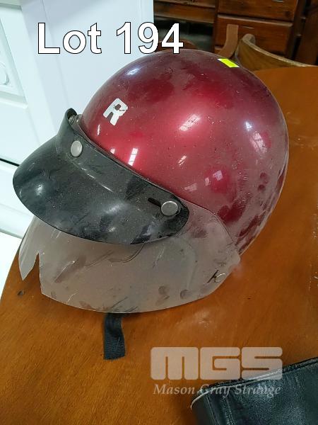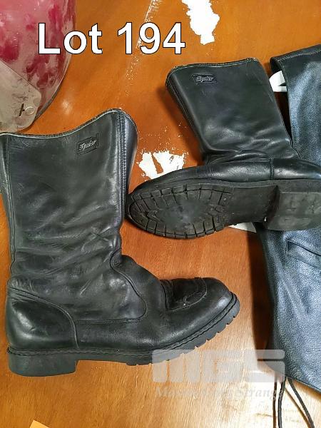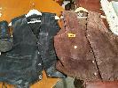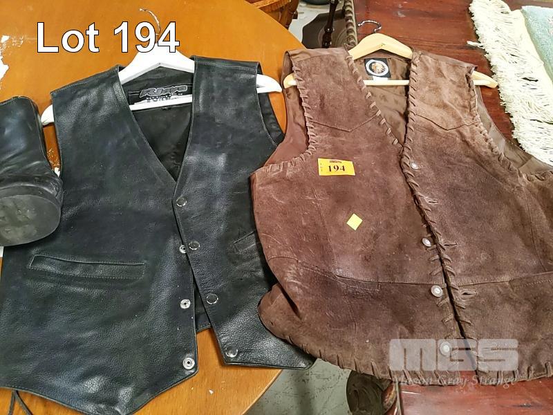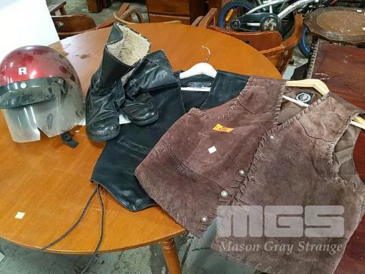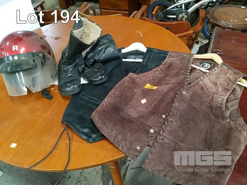 2 x MOTORCYCLE RIDER'S LEATHER VESTS (SIZES S & L), LEATHER BOOTS (EST. SIZE 7) AND HELMET.