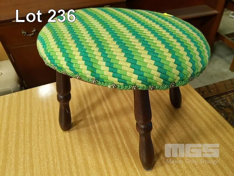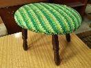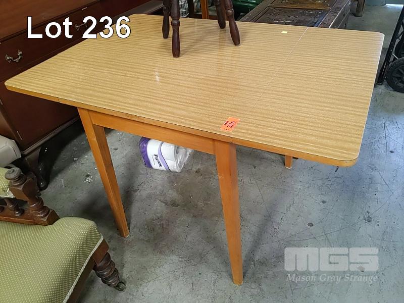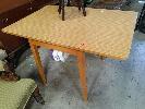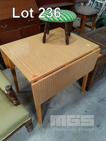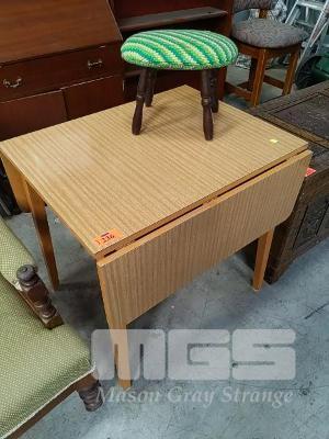 MID CENTURY TIMBER LAMINATE DROP LEAF TABLE AND SMALL FOOTSTOOL WITH TURNED LEGS