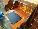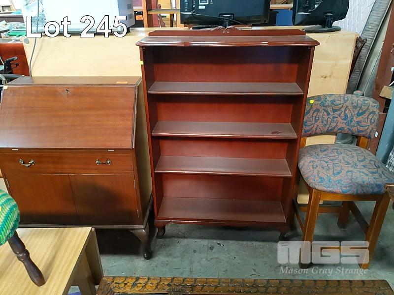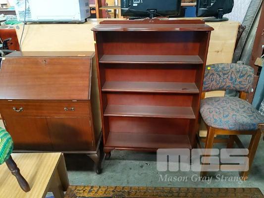 FOLD DOWN QUEEN ANNE STYLE WRITING DESK, 4-SHELF BOOKCASE AND WOODEN BAR CHAIR.