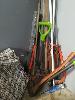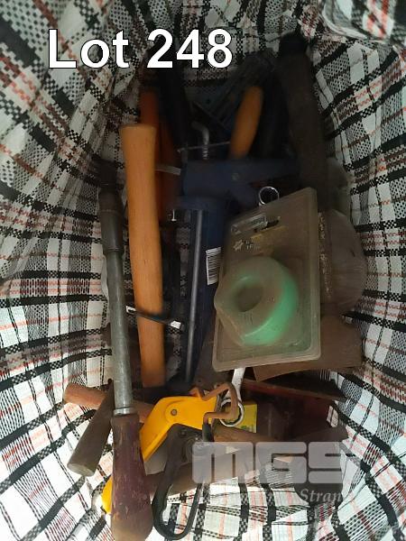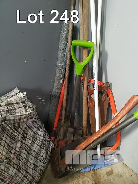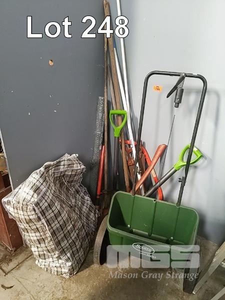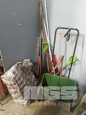 GARDEN IMPLEMENTS, BAG OF TOOLS AND SCOTTS "ACCUGREEN 1000" DROP SPREADER