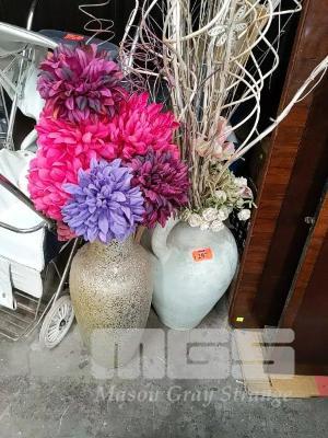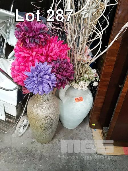 2 x LARGE AMPHORA FLOOR POTS WITH DRIED AND PAPER FLOWERS ETC