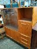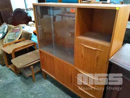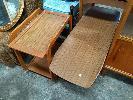 3 x PIECES OF MID CENTURY FURNITURE: TIMBER LAMINATE DRINKS CABINET WITH WATERFALL DOOR HANDLES & SLIDING GLASS DOORS, 2-TIER TROLLEY AND COFFEE TABLE