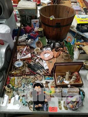QUANTITY OF HOMEWARES AND OTHER INCLUDING FIGURINES, FRIDGE MAGNETS, PAINT BRUSHES, CLOCK, ICE BUCKET, WALKING STICK ETC