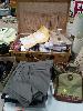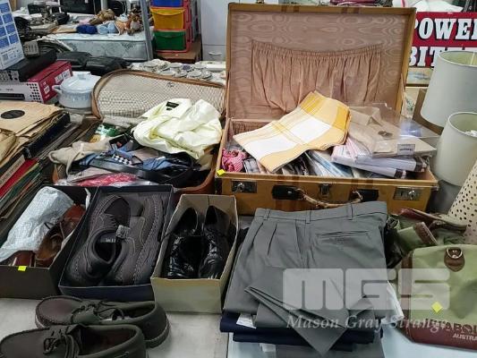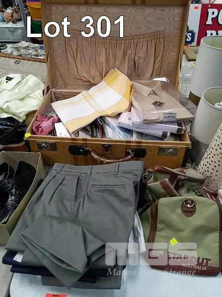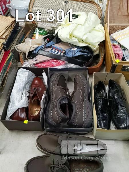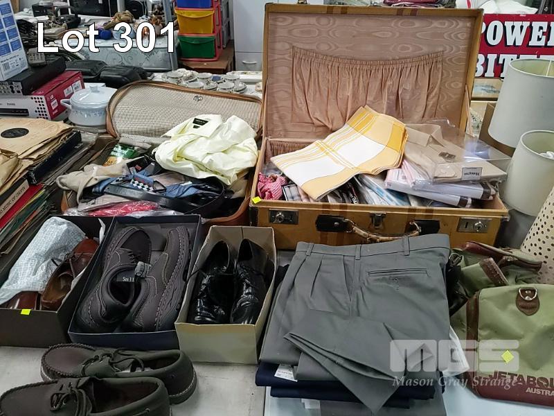 QUANTITY OF MEN'S PANTS (SIZE 82 WAIST), SHOES (SIZES 9 - 11), BELTS, SHIRTS AND OTHER CLOTHING, VINTAGE SUITCASES, BEDDING, HANDKERCHIEFS, TABLECLOTHS, SHOWER CURTAINS AND MUCH MORE