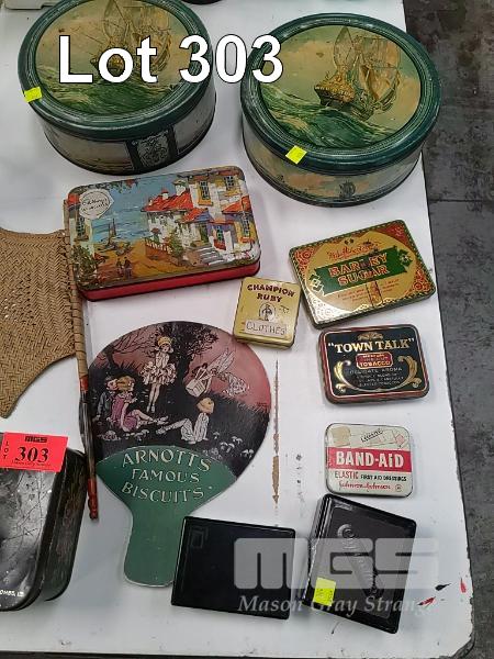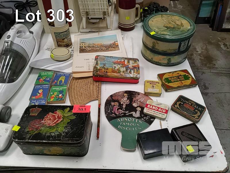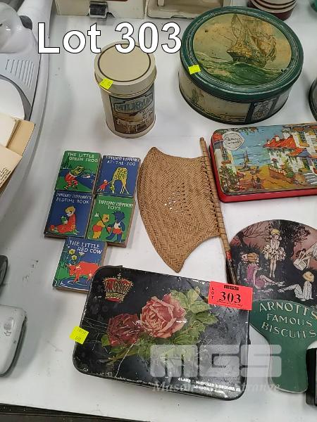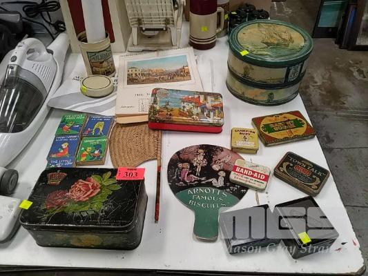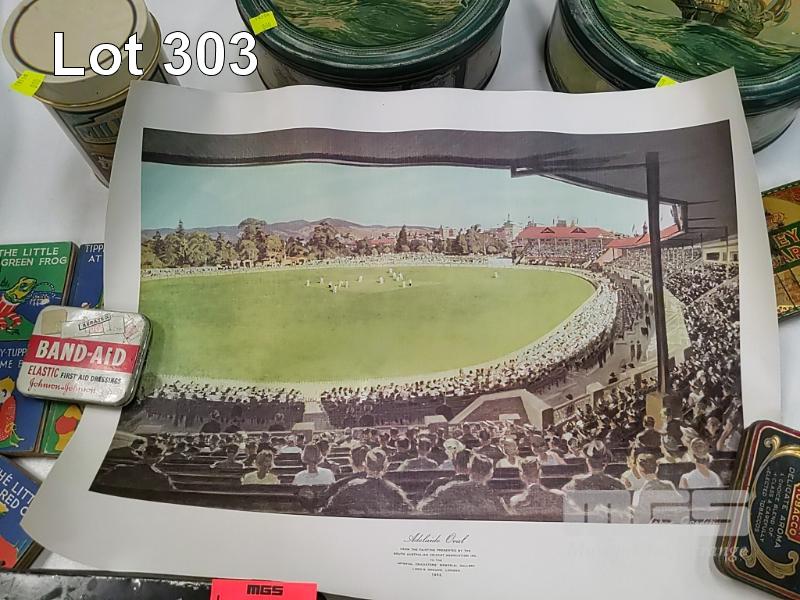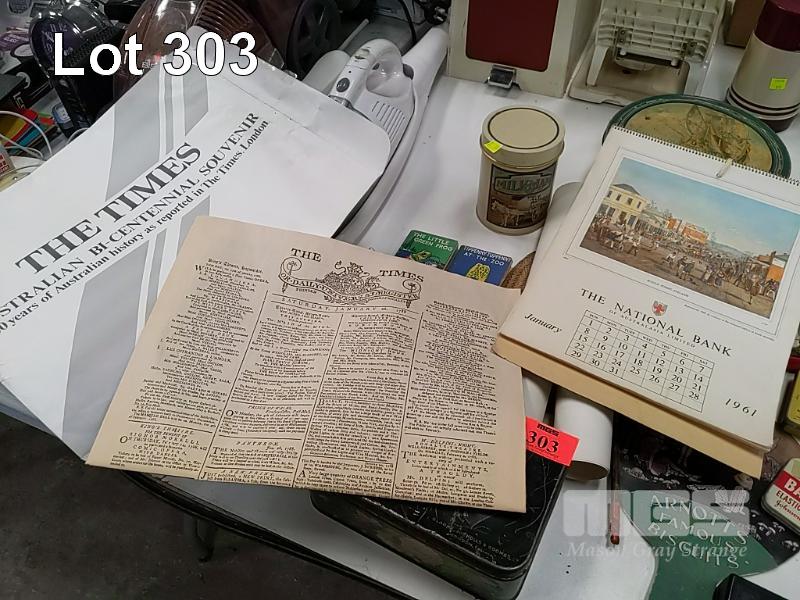 COLLECTION OF VINTAGE TINS AND COLLECTIBLE EPHEMERA INCLUDING PRINT OF ADELAIDE OVAL CIRCA 1982, BICENTENNIAL SOUVENIR EDITION OF THE TIMES LONDON JAN. 26 1788, THE NATIONAL BANK OF AUSTRALIA CALENDAR 1961, 5 x TIPPENNY-TUPPENNY BOKS AND MORE