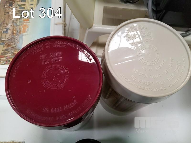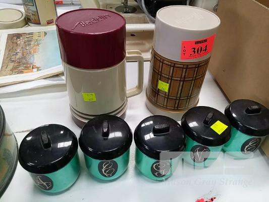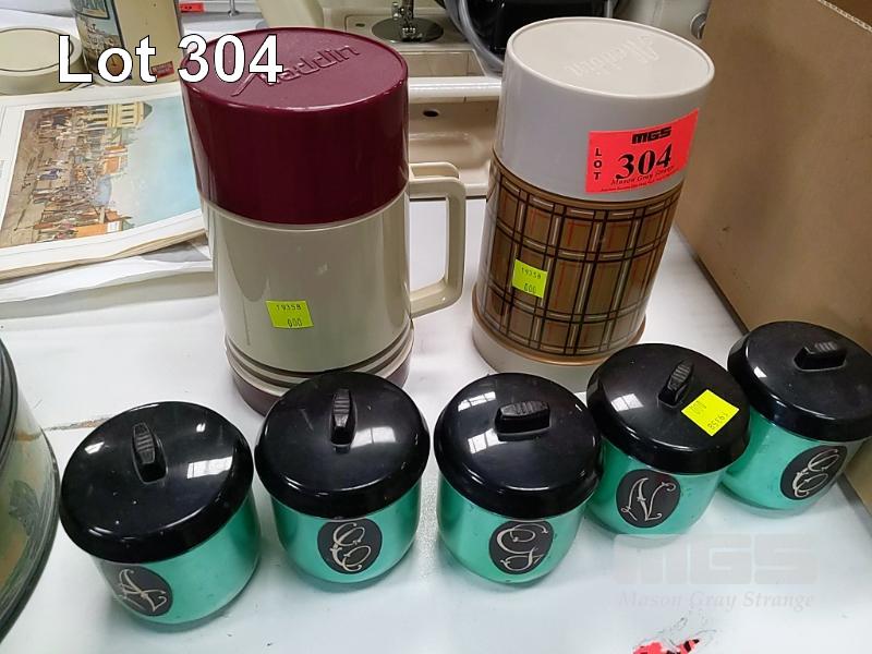 2 x VINTAGE ALADDIN THERMOS FLASKS AND 5 x "MODEL MAID" ALUMINIUM-WARE KITCHEN CONTAINERS
