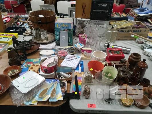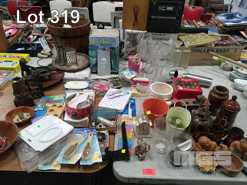 COLLECTION OF HOMEWARES AND OTHER ITEMS OF INTEREST INCLUDING DECANTERS, CARAFE, WOODEN CARVINGS, CAKE & DECORATING MAGAZINES & SUPPLIES, ORNAMENTS AND MORE