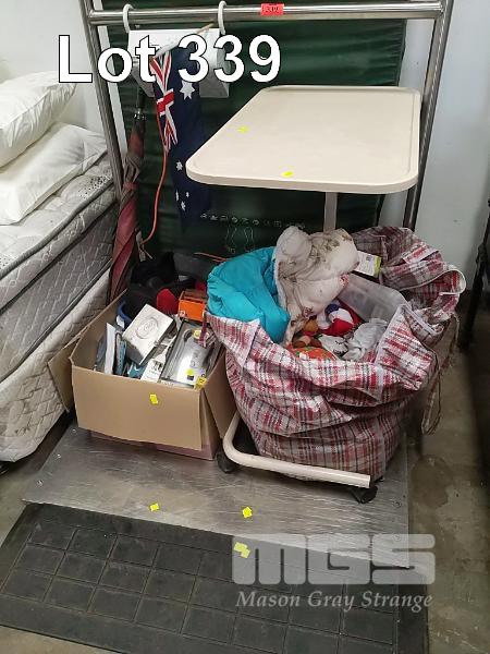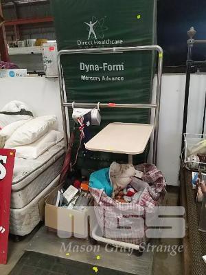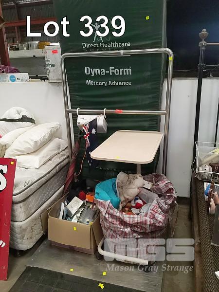 BAY LOT OF GOODS. INCLUDE WHEELCHAIR RAMP WITH EXERCISE BARS, DYNA-FORM PNEUMATIC MATTRESS AND CONTROL, OVER BED MOBILE TABLE, ELECTRICAL APPLIANCES, BOOKS, HOMEWARES, LINEN AND MUCH MORE
