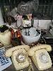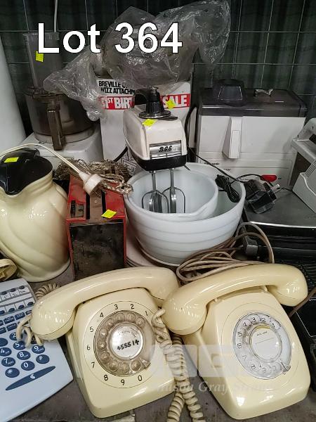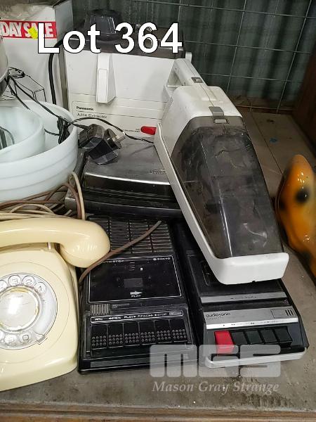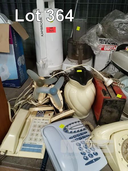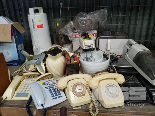 A COLLECTION OF HOUSEHOLD ELECTRICAL INCLUDING KAMBROOK URN, BREVILLE KITCHEN WIZZ, PANASONIC JUICE EXTRACTOR, HAND VACUUM, SANDWICH PRESS AND TOASTER. ALSO VINTAGE TELEPHONES, VINTAGE CASSETTE PLAYERS, KETTLE, FANS AND "B.G.E" MIXER. ALSO TOILET SEAT RAISER