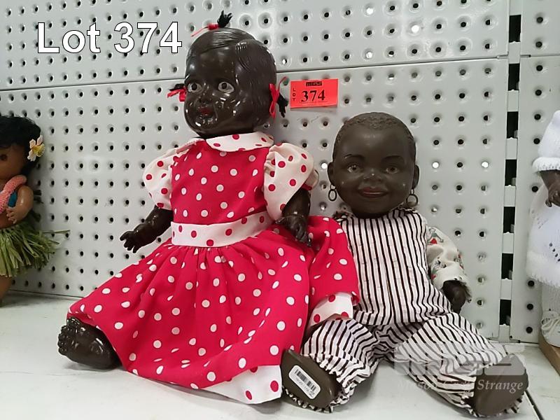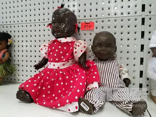 2 x EARLY CELLULOID DOLLS INC BABY IN WHITE/BROWN JUMPSUIT, 35cm (H), LITTLE GIRL IN RED/WHITE