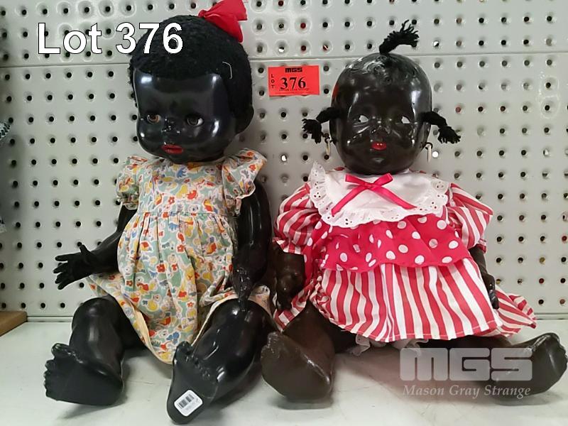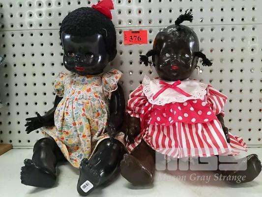 2 x EARLY CELLULOID BABY GIRL DOLLS, RED & WHITE DRESS & MULTI COLOURED DRESS, 45 & 43cm