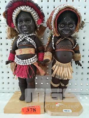 SET 2 RUBBER TRADITIONAL DRESS DOLLS ON STANDS, PAINTED FACES, 34cm (H)