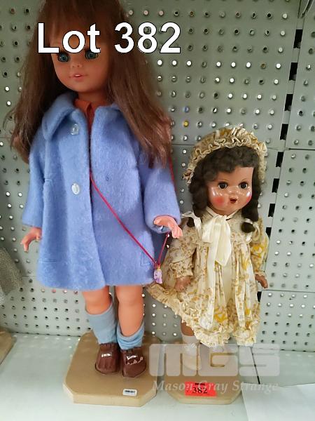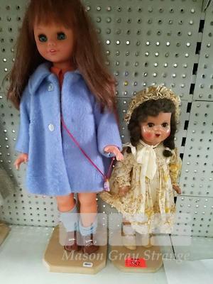 EARLY CELLULOID LITTLE GIRL DOLL ON STAND, YELLOW DRESS, 48cm (H) & RUBBER LITTLE GIRL DOLL ON STAND IN BLUE COAT, 67cm (H)