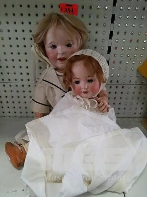 2 x VINTAGE PORCELAIN LITTLE GIRL DOLLS INC LONG WHITE DRESS & BONNET, 37cm (H) & BLUE/WHITE OUTFIT, WRIST MOVEMENT, 59cm