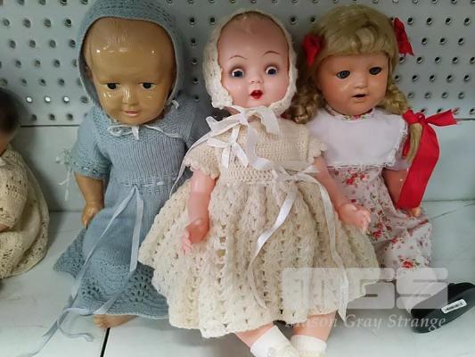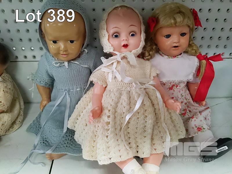 3 x CELLULOID DOLLS INC VINTAGE BABY IN BLUE KNITTED OUTFIT, 43cm (H), BABY DOLL ON WHITE KNITTED DRESS, 40cm & LITTLE GIRL IN PINK FLORAL DRESS, 47cm (H)