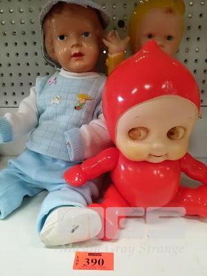 3 x CELLULOID DOLLS INC LITTLE BOY DOLL IN BLUE/WHITE OUTFIT, 56cm (H), RED BABY DOLL, LARGE HEAD, 35cm (H) & YELLOW BABY DOLL, 40cm (H)
