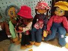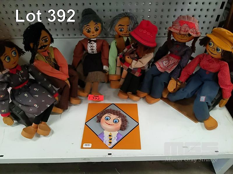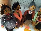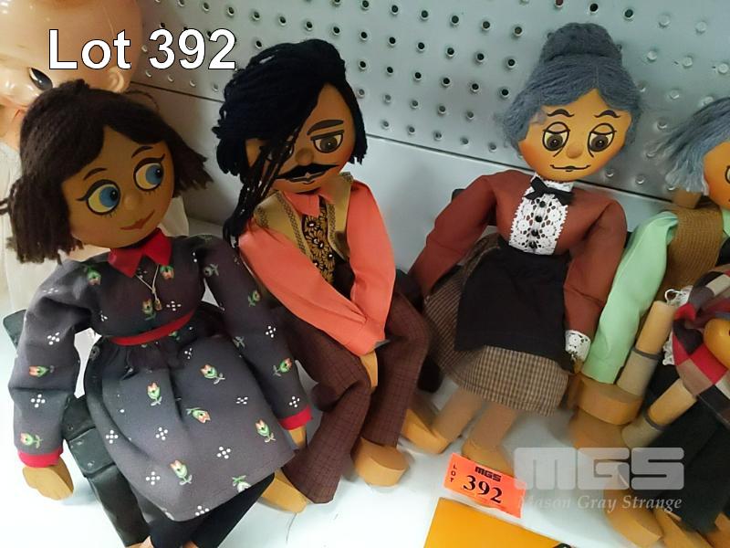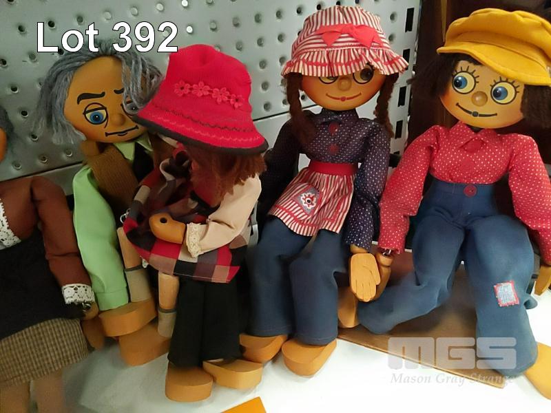 FAMILY OF WOODEN CLOTH DOLLS ON BENCHES