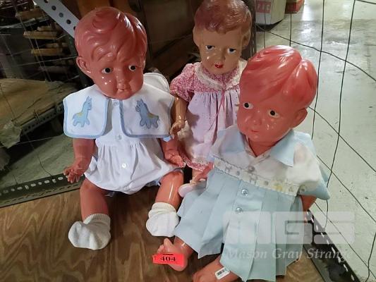 3 x EARLY CELLULOID BABY DOLLS INC BABY BOY IN BLUE/WHITE OUTFIT, 68cm, BABY GIRL IN PINK/WHITE OUTFIT, 55cm & BABY BOY IN BLUE OUTFIT, 54cm