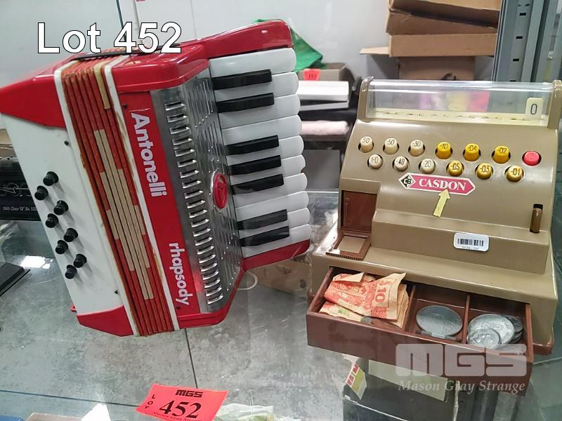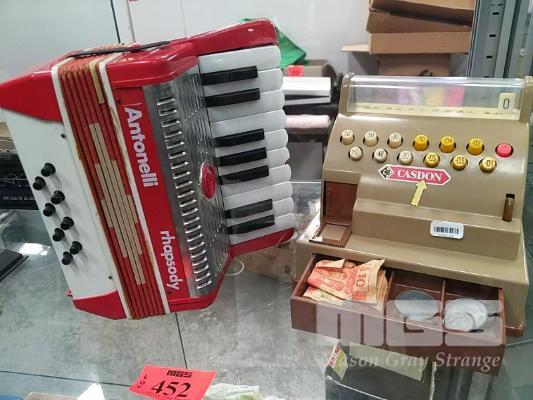 PLASTIC TOY PIANO ACCORDION, ITALY & PLASTIC TOY CASH REGISTER, ENGLISH WITH TOY MONEY