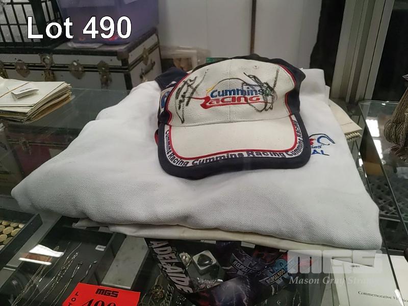 RACING APPAREL INC HAT SIGNED BY GARTH TANDER & JASON BARGWARNER, LEMANS POLO TOP, ADELAIDE F1 WATERPROOF PANTS & LANYARD
