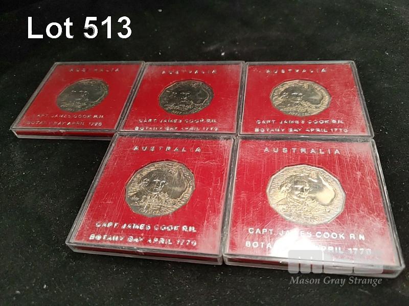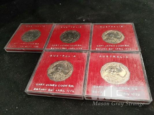 5 X CASED, AUSTRALIA, 1970, 50c COINS, CAPTAIN JAMES COOK