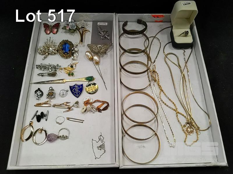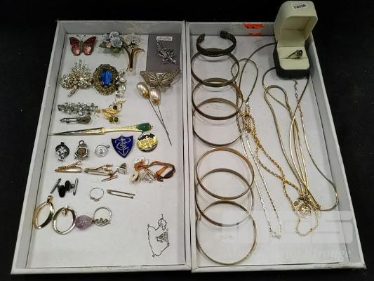 ASSORTED BROOCHES, BADGES, TIE PINS, PENDANTS, NECKLACES, BANGLES, ETC