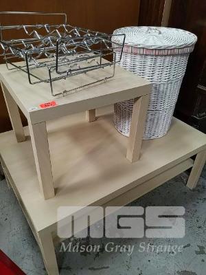 BEACHOOD LAMINATE RECTANGULAR COFFEE TABLE WITH MATCHING SIDE TABLE, CHROME WINE RACKS & SET OF 3 WICKER BASKETS