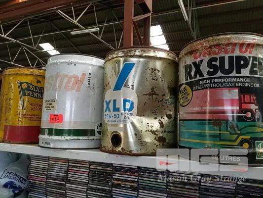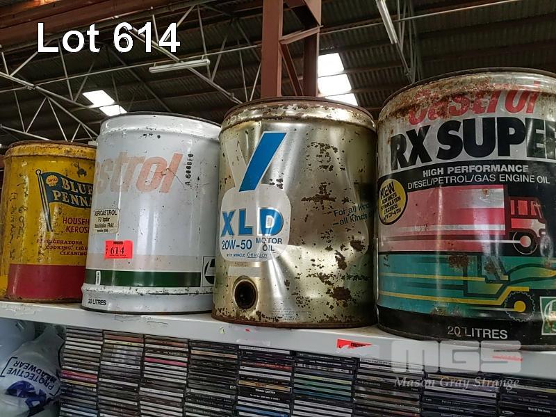4 x PETRONALIA TINS, 20 LITRE, INC SHELL, BLUE PENNANT, CASTROL, VALVOLINE & RX SUPER
