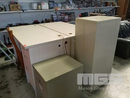 PAIR OF BEACHWOOD LAMINATE RECEPTION COUNTERS, HEIGHT 105cm, WITH METAL 2 DRAWER & 4 DRAWER FILING CABINETS (NO KEYS) & 2 X PINE DINING CHAIRS