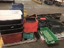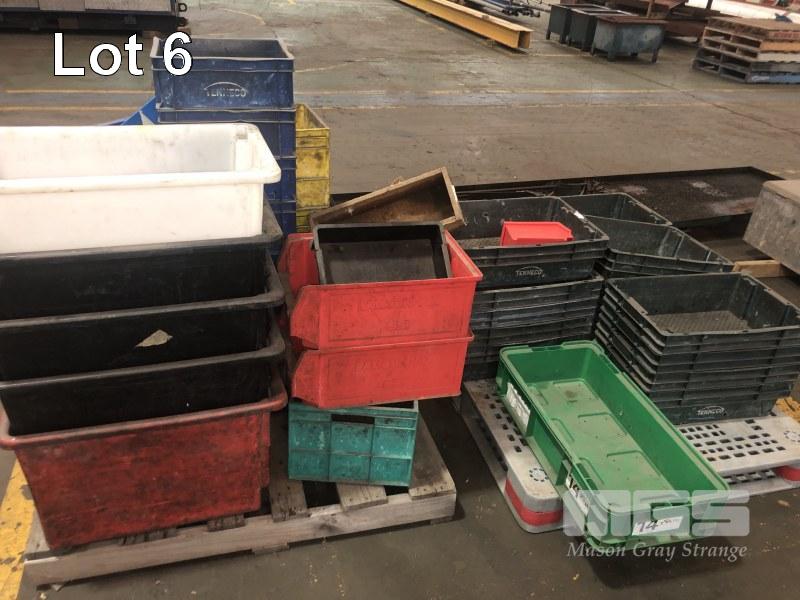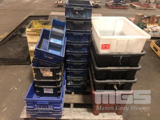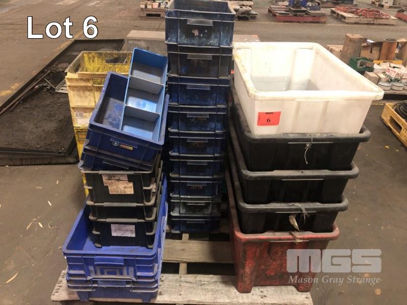 ASSORTED PLASTIC PARTS TUBS, VARIOUS SIZES & TYPES, STACKABLE, APPROX 60 PIECES