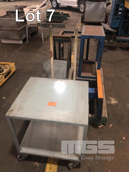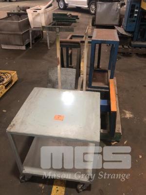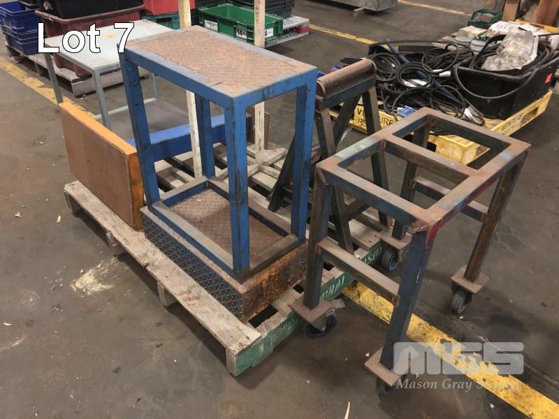 5 x VARIOUS STEEL STANDS PLUS 1 x TROLLEY, HEAVY DUTY, 1 x ROLLER, A-FRAME