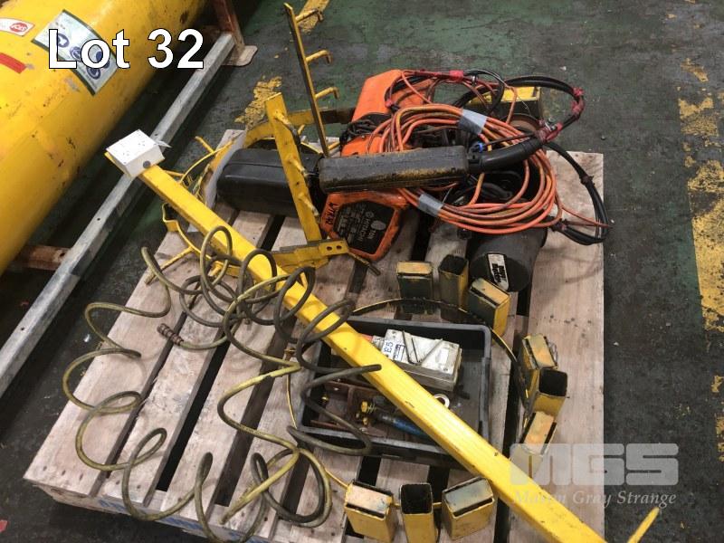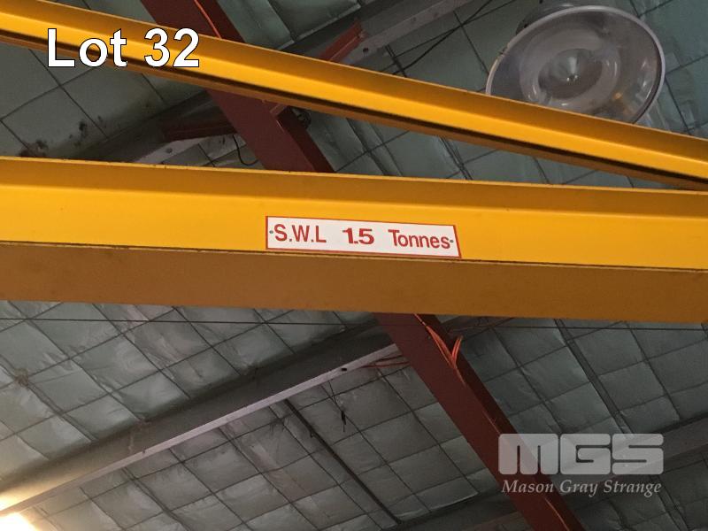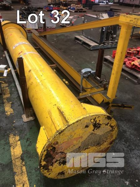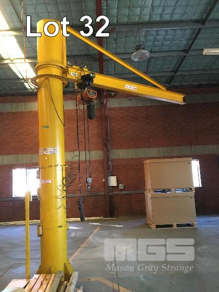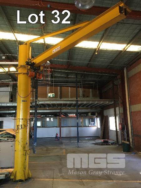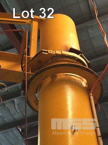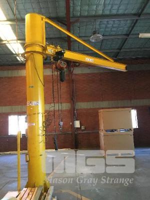 FREE STANDING SWING ARM CRANE, HITACHI, 2 TONNE, 360 DEG. ROTATION PENDANT CONTROL, CHAIN HOIST POWERED TRAVEL POST 4800mm HIGH 400mm DIAMETER COLUMN BASE PLATE 4200mm LONG ARM DISMANTALED FOR TRANSPORT