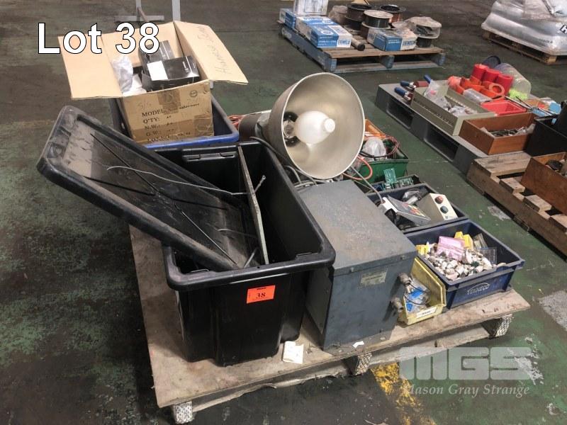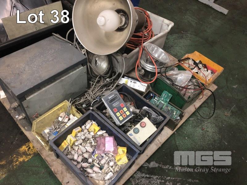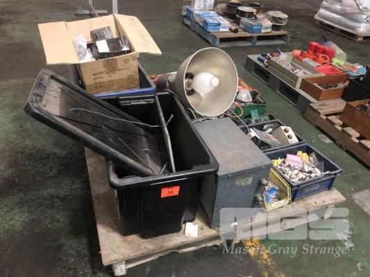 ASSORTED ELECTRICAL COMPONENTS, SWITCHES, CONTACTROS, FUSES, LIGHT FITTINGS, TRANSFORMER,