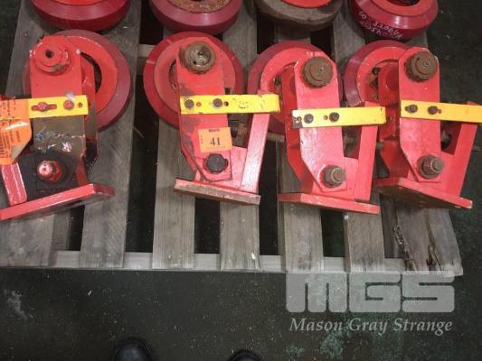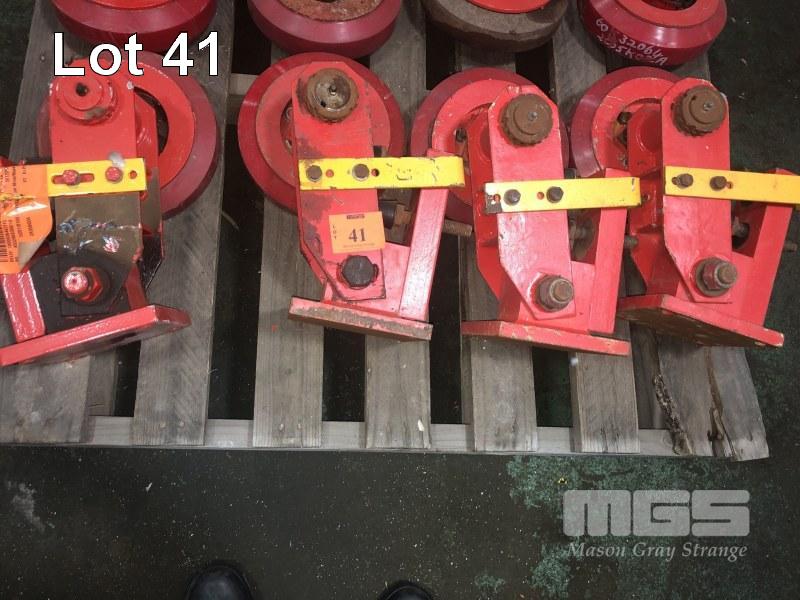 4 x EXTRA HEAVY DUTY CASTORS, RED NYLON WHEELS, 250 x 40mm WITH ADJUSTABLE RUBBER STOPS & SWING ARM ASSEMBLY
